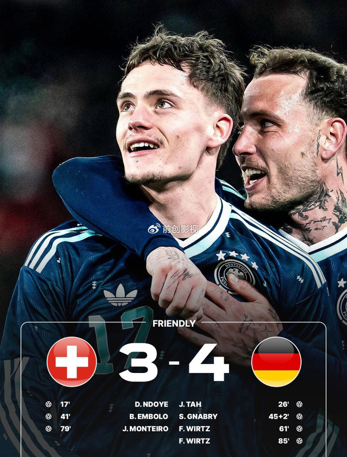 随着世界杯脚步声越来越近,国家队们都在进行热身赛备战,当然德国队也在其中,他们与瑞士队为球迷献上了一场进球大战,最终德国队在90分钟内4-3绝杀对手,维尔茨成为了本场比赛最亮的仔,一人独造4球,并且在最后时刻一记世界波“灭掉”瑞士,直接把利物浦球迷给看馋,你为何在安菲尔德就没这表现呢?看来,斯洛特依旧没有找到德国核心的说明书!